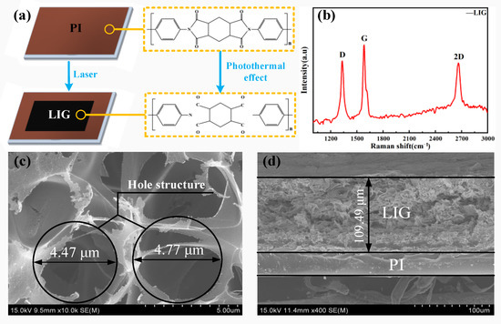 Physical characterization analysis of LIG: (a) Principle of preparing LIG; (b) Raman scatteringspectrum of LIG; (c) SEM surface micromorphology of LIG; (d) SEM cross-sectional micromorphology of LIG.