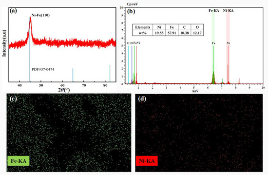 XRD and EDS patterns of Ni-Fe/LIG: (a) XRD pattern of Ni-Fe/LIG; (b) graph of the characteristic peaks of Ni-Fe/LIG; (c) EDS element distribution of Fe; (d) EDS element distribution of Ni.