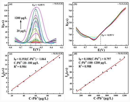 This figure indicates that the Ip of the SWASV curve also increases with the increase in C-Pb2+ and that a linear relationship exists between Ip and C-Pb2+. Figure 8c,d show the fitting linear curves of Ip (µA) and C-Pb2+ (µg/L) in the SWASV curve of Ni-Fe/LIG at the two Pb(II) concentrations of 20–100 and 100–1200 µg/L: