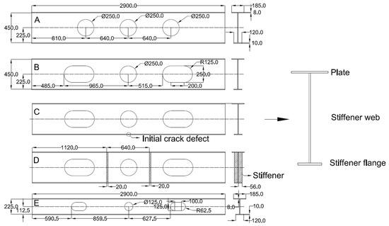 The combined opening girder between two bulkheads was selected for investigation, consisting of three parts, i.e., plate, stiffener web and stiffener flange. The common opening form specimens on passenger ships were selected for investigation, identified as specimens A and B. In addition, some girders were reinforced by ribs (as shown in Figure 1b). Specimen D was identified based on this form, and the ribs were simplified to the shape of stiffeners. Furthermore, to investigate the relationship between initial crack defects and the buckling behavior of the structure, specimen C was identified. Finally, to compare the difference between the high-web structure of passenger ships and the low-web structure of conventional ships, specimen E was identified.