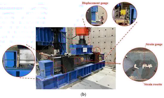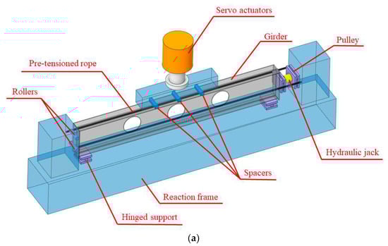 A loading system was designed to have an axial compression load and a uniform load across the span. In the axial direction, a hydraulic jack with 500 kN thrust was used for loading. And in the vertical direction, a 4000 kN thrust servo actuator was used. To simulate the vertical uniform load applied around the span (±355 mm), three spacers were placed to simulate the uniform load. Above this, a distribution girder was arranged to apply the vertical load. At the ends of the girders, rollers and pulleys were set to release the rotational freedom of the ends. In addition, the height of the rollers and pulleys was adjusted with wooden blocks, and the center was aligned with the neutral axis of the girder. In order to keep the axial forces stable, pretensioned ropes were placed on both sides of the girder to limit the slight deformation of the reaction frame. The layout of the experimental setup is shown in Figure 3.