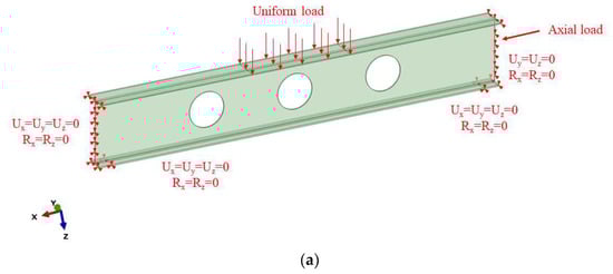 To verify the reliability of the experimental results, the same numerical simulations were carried out, and the results were compared with the experimental values. For the application of the load, a uniform load was applied in the area of ±355 mm in the middle of the plate, and an axial force was applied along the length of the girder. In addition, during the numerical simulation, a C3D8R hexahedral unit was used. The grid size of the main body was determined to be 10 mm after verification of the grid independence. Moderate encryption was applied at the openings and plate junctions to improve the accuracy of the calculation. For specimen A, the number of the completed units divided was 221,428. The remaining specimens also remained on the order of 200,000 girders, with slight differences due to the area of the openings. For the material parameters of Ah36, the elastic modulus of the material was 206 GPa, and the yield strength was 375 MPa. The tangent modulus of the material was taken as 10%. The boundary conditions were set as shown in Figure 6a and the gridding of specimen A is shown in Figure 6b.