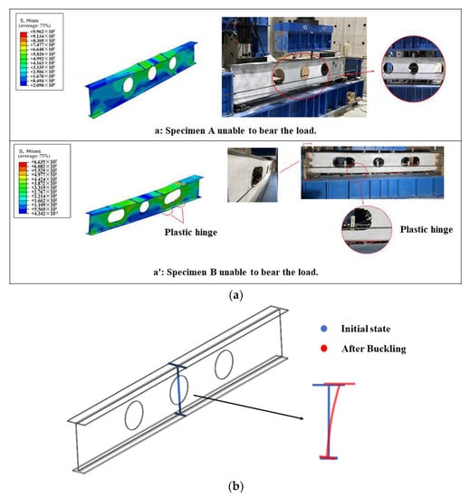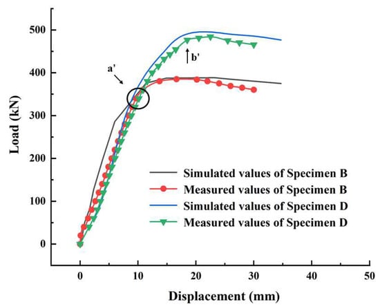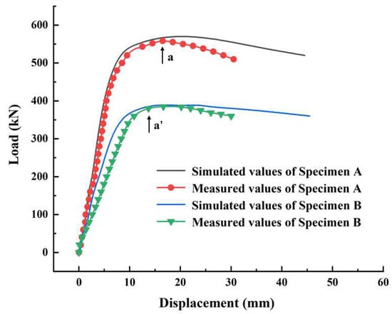 As shown in Figure 7 and Figure 8, due to the difference in the shape of the opening, the load–displacement curves as well as the buckling behavior of the two specimens differed to some extent. As shown in Figure 7, the trends and the extreme values in the load–displacement curves of the two specimens were very different. During the o-a and o-a’ phases, the deformation of the structure increased in small steps as the external load increased linearly. However, the slope of the curve for specimen A was greater, which means that in the elastic phase, the same external load was applied and the deformation occurred more significantly in specimen B. When reaching points a and a’, the specimens could no longer bear the load. At this point, the maximum load that specimen A could bear was 558 kN, while for specimen B, it was 385 kN. Compared with specimen A, the reduction in the maximum load-bearing capacity of specimen B reached 31%.