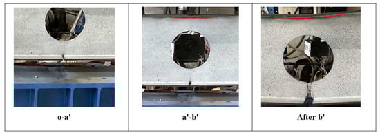 In addition, there was considerable variation in the form of the failure of specimen C. When analyzed in conjunction with Figure 10 and Figure 11, the vertical displacement of specimen C increased linearly with the increase in the external load during the o-a’ phase. During this phase, the width of the initial crack on the stiffener flange gradually increased, and no significant deformation occurred in the stiffener web and plate. For the a’-b’ phase, there was a small increase in the load-bearing capacity of the structure, but the vertical deformation increased significantly. As shown in the actual structure, the stiffener web tore from the crack in the stiffener flange, gradually expanding towards the lower edge of the round opening. At this point, it was accompanied by the distinct tearing of the steel plate. The plate at the top of the round opening showed no significant bending. For the phase after point b’, the structure could not bear more load, the data recorded by the load sensor decreased and the vertical deformation of the structure became noticeably bigger. The stiffener web was completely torn below the round opening. The plate was bent under external loads, and the phenomenon of plastic hinge failure occurred.