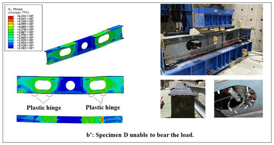 As shown in the load–displacement curve, during the o-a’ phase the two specimens displayed similar trends of vertical deformation. As the external load increased, the vertical deformation of the two specimens increased linearly. However, when the external load reached 365 kN (point a’), the following form of deformation of the two specimens differed. As analyzed in Section 3.2, a lateral slip in the middle of the plate occurred in specimen B, and the structure became unstable and was unable to bear more load. But for specimen D, due to the lateral slip of the structure being restrained by the stiffeners, no premature instability of the structure occurred. Therefore, in the load–displacement curve, the displacement increased linearly to point b’ as the external load increased. During the phase after b’, the value of the load sensor decreased rapidly, and the structure displayed significant vertical deformation. Significant wavy deformation occurred in the steel plates around the lumbar round opening corners (as shown in Figure 13). In addition, the magnitude of the lateral slip in the middle of the plate was significantly smaller compared to that of specimen B. Plastic hinge failure was evident at the corner of both lumbar round openings (as the area marked by red circles in Figure 13). The central area of the girder was restrained by the stiffeners, forming a frame structure around the round openings. When the structure buckled, significant vertical displacement occurred in this frame area.