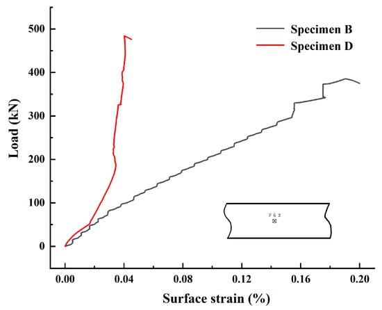 As shown in Figure 14, the strain at the measurement point F-G-3 for specimen B was greater. It could be seen that due to the restraint of the ribs, specimen D was subjected to significantly less tensile stress than specimen B in the middle of the stiffener flange. When analyzed in conjunction with the buckling behavior, the stiffeners formed a complete frame structure around the round opening, resulting in local self-restraint. Therefore, as the external load increased, the specimen displayed an overall vertical displacement in the region that was restrained by stiffeners, and the plastic hinge failure phenomenon occurred at the lumbar round openings. The deformation energy of the specimen was released from the plastic hinge bend of the steel plate and the wavy deformation around the corner of the lumbar round openings, and the strain values measured at point F-G-3 were much smaller than those of specimen B.