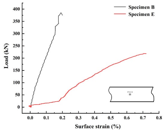 As shown in Figure 17, the strain at the measurement point F-G-3 for specimen E was much larger. It could be seen that due to the reduced height of the stiffener web, the structure was more prone to the occurrence of vertical deformation in the central region. As shown in the strain values at the measurement point F-G-3, the strain gauge values increased rapidly with the increase in the external load. This showed that when the stiffener web height was reduced, the vertical deformation in the middle of the specimen under the bending moment was more pronounced. In contrast, for the structures with high stiffener web heights, structural instability due to the lateral slip of the plate occurred more often.