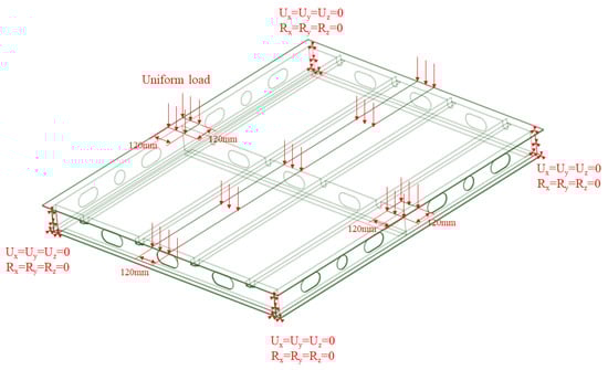 In order to simulate the combined loading conditions above the extreme span opening, a 120 mm width area in the middle of the lengthwise plate was loaded. And above the longitudinal girders, two 120 × 120 mm areas were selected for loading. The ends of the longitudinal girders were restrained with fixed ends. After verification of the grid independence, the size of the grid was determined to be 10 mm, and the number of elements was determined to be approximately 300,000. The means of the load application and the form of the boundary conditions are shown in Figure 19.