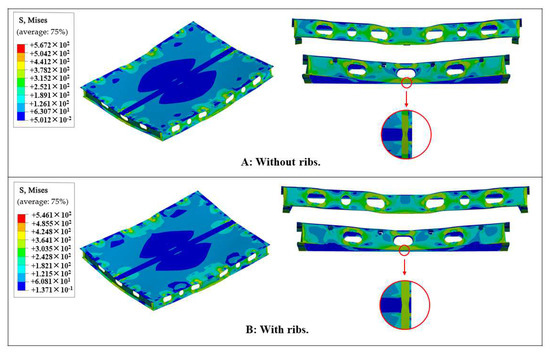 As shown in Figure 20, the buckling behavior of the two plate frames was generally similar. For the plate, due to the cross-shape loading pattern, the structure showed a contraction towards the center of the plate. The center formed a shell-shaped low-stress area arranged symmetrically along the length. For the longitudinal girder, plastic hinge failure was evident at the corner of the central lumbar round openings. There was an overall vertical deformation in the area of the middle transverse. For the transverses, the vertical deformation was generated by the external load. In addition, in the middle position, a plastic hinge failure phenomenon in the stiffener flange was observed. For plate frame A, a lateral slip of the stiffener flange also occurred in the middle of the transverses, with large twisting deformations occurring at the plastic hinge. For plate frame B, the overall form of deformation was the same as that of plate frame A. However, due to the support of the ribs, the lateral slip of the stiffener flange in the middle was reduced, and the twisting deformation at the plastic hinge was also reduced. In addition, the ultimate load that plate frame A could bear was 408 kN. Meanwhile, for plate frame B, the addition of the ribs resulted in an ultimate load of 450 kN, with an increase of 10.3%. In addition, the restraint of the ribs provided some improvement in the deformation pattern of the transverses in the event of failure. Therefore, in actual ship structures, the strengthening of the structure could be achieved by adding a reasonable number of ribs in regions where the load is high.