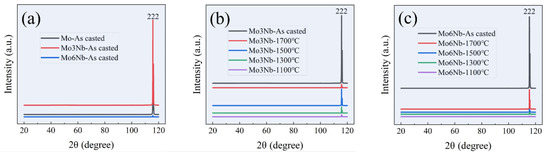 XRD patterns for casted Mo, Mo3Nb, and Mo6Nb are shown in Figure 1a. The 2θ ranges from 20° to 120°. Only 222 peaks are detected at ~117° (an extinction of light occurs at 111 orientation). Such features not only justify the growing direction is 111, but also prove the single crystal body-centered cubic (BCC) structure for all samples. Although the lattice misfit is enhanced as the Nb content increases, the structural stability is maintained after adding 6 at.% content. Figure 1b,c, respectively, show the microstructural evolution of Mo3Nb and Mo6Nb after thermal annealing at 1100 °C, 1300 °C, 1500 °C, and 1700 °C for 2 h. Still, only 222 peaks are detected at ~117° in all annealed samples. The same features of casted and annealed Mo3Nb and Mo6Nb suggest no recrystallization occurs, which means a high thermal stability (≤1700 °C) of Mo and MoNb single crystals.