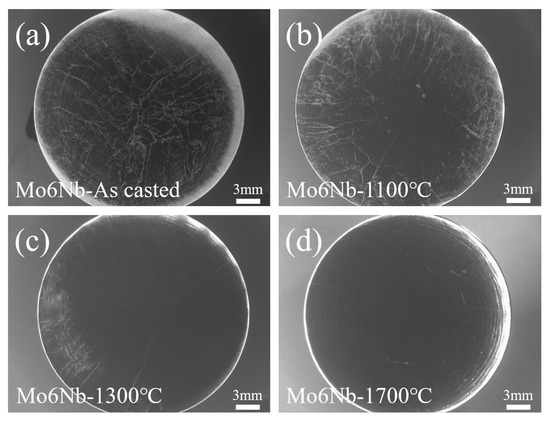 To observe the evolution of the low-angle grain boundary after annealing, metallographic photos of Mo3Nb single crystals were taken and are shown in Figure 2. The reticular wave lines on the surface of MoNb single crystals are known as the low-angle grain boundary. Figure 2a shows the distribution of the low-angle grain boundary for as-casted Mo3Nb single crystals. Low density in the center part and a relatively higher density at the edge were observed, which is consistent with the thermal diffusion direction. The density of the low-angle grain boundary in Mo3Nb rises after annealing at 1100 °C, as shown in Figure 2b. Then, the density of the low-angle grain boundary drops after annealing at high temperatures, as shown in Figure 2c,d. As shown in Figure 2c, the low-angle grain boundary in the center part dramatically decreases. For the samples after 1700 °C annealing, nearly all of the wave lines are absent, as shown in Figure 2d.