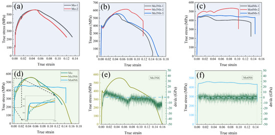 Figure 4d shows representative Mo, Mo3Nb, and Mo6Nb curves, in order to compare different deformation features. No obvious difference was observed among the three curves before yield, suggesting a small content of Nb addition has little influence on the elastic contacts of Mo. Yield happens in Mo single crystals first. Then, true stress increases slowly as the strain continues, as shown in Figure 4a. For Mo3Nb single crystals, true stress drops ~20 MPa at 1% strain after yield, followed by a gentle rise during subsequent loading, as shown in Figure 4b. Yield enhances as the Nb content increases. Mo6Nb possesses higher strength (~450 MPa) than Mo3Nb and Mo. Furthermore, the stress in Mo6Nb maintains at a relatively stable level until failure, as shown in Figure 4c,f, which means a stable flow and dislocation movement. Severe work hardening occurs in Mo3Nb at true strain ranges from 1.5% to ~5%, and then, softening occurs and stress drops quickly until failure, as shown in Figure 4e. The true stress maintains a stable value after yield to fracture, which suggests a relatively uniform plastic flow. In summary, the addition of Nb not only enhances the strength of Mo but also improves the stability of mechanical properties.