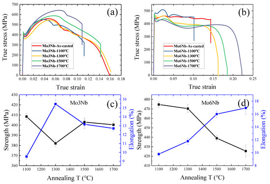Representative true stress-true strain curves of Mo3Nb and Mo6Nb after annealing are shown in Figure 5a,b, respectively. Thermal annealing has little effect on the deformation features, such as elastic to plastic regions and work-hardening behavior. An outstanding behavior in Mo3Nb single crystals is the stress drop after yield, which disappears after annealing at 1700 °C. Such behavior is related to dislocation de-pinned at the yield point. Annealing at 1700 °C makes solute atoms distribute more uniformly than as-casted Mo3Nb single crystals.