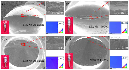 Figure 6 shows microscopes of fracture surfaces after tension. The fracture surface section in Mo3Nb looks like a thin line at the edge. The middle part shows river patterns that suggest inhomogeneous deformation, as shown in the insert (a-I). Such a kind of feature is caused by severe shrinkage in one direction, but relatively small shrinkage in another direction. In Figure 6b, the 1700 °C annealed Mo3Nb behaves the same fracture mode with the as-casted Mo3Nb. Still, some defects, such as holes, were detected near the middle part of the fracture section. The area of the fracture surface is larger in the 1700 °C annealed Mo6Nb than in the as-casted one.