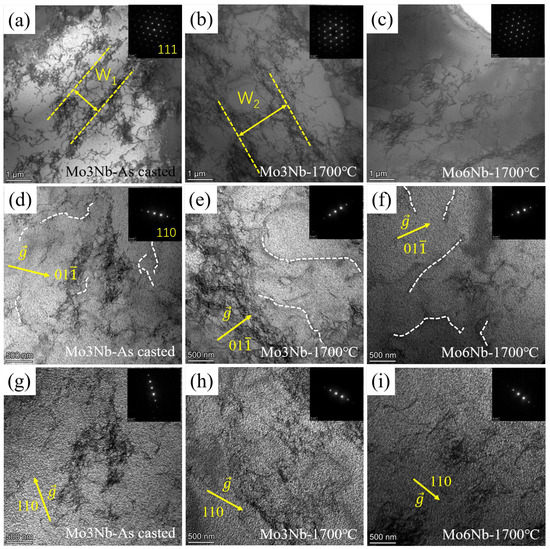 Figure 7 shows TEM figures of deformed samples. All images are observed along the 111 zone axis. Many tangled dislocation lines are observed in the deformed samples. There are some differences in the density of dislocation. Firstly, the density of dislocation in the 1700 °C annealed Mo3Nb is less than in the as-casted Mo3Nb. The width between the two groups of tangled dislocations in the as-casted Mo3Nb (W1 in Figure 7a) is thinner than in the 1700 °C annealed Mo3Nb (W2 in Figure 7b). Such a trend means some dislocations have been removed via annealing at 1700 °C. Secondly, the dislocation density in the 1700 °C annealed Mo6Nb is less than in the 1700 °C annealed Mo3Nb, which may lead to a higher strength in Mo6Nb than Mo3Nb. Figure 7d,g shows the magnifications of the dislocation feature in Figure 7a. in Figure 7d,g are and 110, respectively. Those white dotted lines in Figure 7d represent dislocation lines that are visible in Figure 7d, but invisible in Figure 7g. Thus, those dislocations in Figure 7d should have . There are still some tangled dislocations that have not been justified. The magnifications of the dislocation feature in Figure 7a are shown in Figure 7e,h. Two long dislocations signed as dotted lines have The corresponding dotted lines in Figure 7f,i still have Less tangled dislocation is observed in the 1700 °C annealed Mo6Nb than in the 1700 °C annealed Mo3Nb, which is ensured via Figure 7e,f.