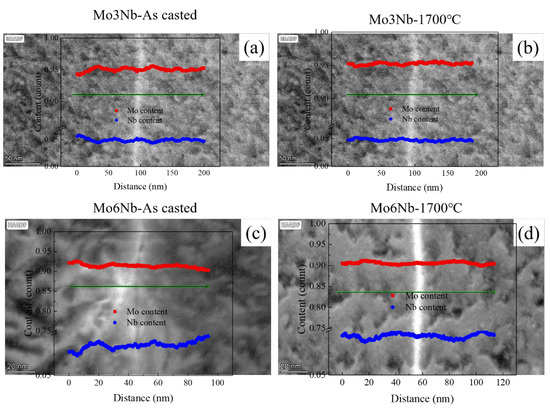 Figure 8 shows the line-scanning EDS data along dislocations in the as-casted Mo3Nb, the 1700 °C annealed Mo3Nb, the as-casted Mo6Nb, and the 1700 °C annealed Mo6Nb. The white lines in the middle of the TEM images show the positions of the dislocations. There is no obvious fluctuation in Mo in all of the samples, as shown in the red figures in Figure 8. The fluctuation in Re, however, is less severe in the as-casted Mo3Nb than in Mo6Nb, as shown in Figure 8a,c. After annealing at 1700 °C, Nb fluctuates smoothly in both Mo3Nb and Mo6Nb, meaning Nb distributes more uniformly after 1700 °C annealing. In detail, the dislocation in the as-casted Mo3Nb has a bit concentration of Nb, which is eliminated after annealing at 1700 °C, as shown in Figure 8a,b. In the as-casted Mo6Nb, the Nb content around the dislocation is a little higher than the matrix. Similar to Mo3Nb, the Nb concentration in dislocation is eliminated to a large extent after annealing. Therefore, thermal annealing makes the microstructure more homogeneous than the as-casted Mo-Nb single crystals.