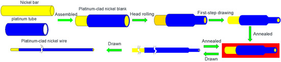 Platinum and nickel with a purity of ≥99.95% were selected as the raw materials. Nickel rods and two types of seamless platinum tubes with different wall thicknesses were prepared by ingot casting, rolling, drawing, and annealing. The sizes of the nickel rods and platinum tubes are shown in Table 1.