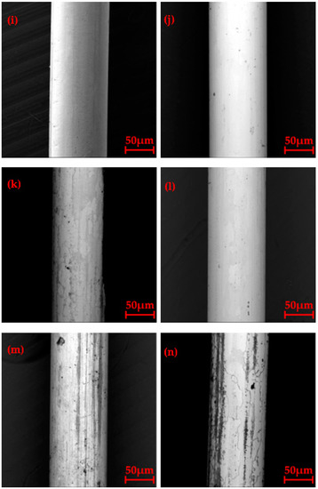 Figure 4 shows the surface morphologies of the platinum-clad nickel composite wires after oxidation. There was no change on the surface of the composite wires when oxidized at 500 °C for 1 h, 2 h, and 3 h, as shown in Figure 4a,b,i,j,q,r. When the oxidation treatment was performed at 600 °C, the platinum layer recrystallized, and there were obvious grain boundaries on the surface. However, with the increase in heat treatment time, the grains did not significantly grow, as shown in Figure 4c,d,k,l,s,t. This demonstrated that the platinum-clad nickel composite wire could be used for a short time (3 h) below 600 °C and would not oxidize or fail. When the oxidation treatment was performed at 700 °C, black streaks appeared along the axial direction; these gradually increased with an increase in the heat treatment time, as shown in Figure 4e,f,m,n,u,v. At the same oxidation time, the black streaks on the surface of the composite wire with a platinum layer of 5 μm were significantly more frequent than those of the 8 μm wire. With an increase in the heat treatment time, the grain boundaries of the surface platinum layer grains became significantly darker and coarser, as can be seen in Figure 4h,v. When the oxidation temperature exceeded 700 °C, the thickness of the platinum layer had little effect on the oxidation resistance and surface oxidation occurred, indicating that the platinum-clad nickel composite wire was not suitable for use at high temperatures (≥700 °C).