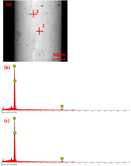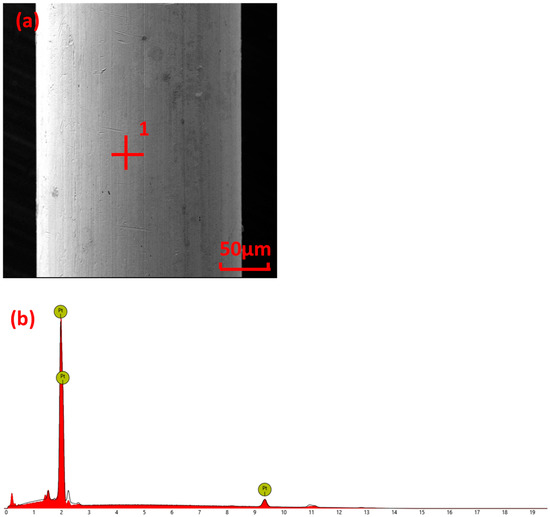 Figure 5 shows the surface morphology and energy spectrum analysis results of Sample 1 oxidized at 500 °C for 3 h. The surface of the composite wire was smooth and clean; this was the same as before oxidation, as shown in Figure 5a. Only the platinum without other elements was on the surface, as shown in Figure 5b, indicating that the platinum-clad nickel composite wire had good stability at 500 °C.