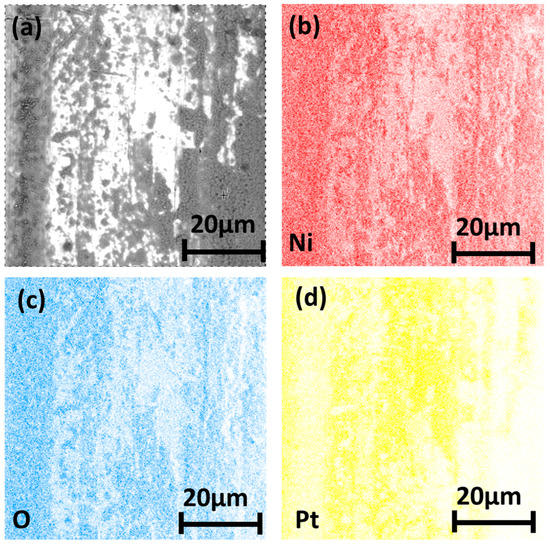 Figure 8 shows the element mapping analysis of Sample 2 oxidized at 700 °C for 3 h. Cracks were present on the surface of the composite wire, and the morphology and distribution of the cracks were similar to the grain boundaries of the grains in Figure 4c,d,k,l,s,t. Therefore, we inferred that the cracks appeared at the grain boundaries of the platinum. There was also a large number of axial black stripes on the surface of the wire. The nickel and oxygen elements were distributed along the cracks on the surface of the wire, as shown in Figure 8b–d, indicating that the nickel had diffused to the surface through the grain boundaries and was oxidized to NiO. The black stripes were nickel and oxygen; this was because the thickness of the platinum layer was undulating. Nickel first diffused from the thinnest place of the platinum layer to the surface of the wire and was oxidized.