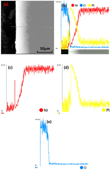 SEM–EDS line scans of the interface of Sample 2 oxidized at 800 °C for 2 h: (a) SEM; (b) total; (c) nickel; (d) platinum; (e) oxygen.