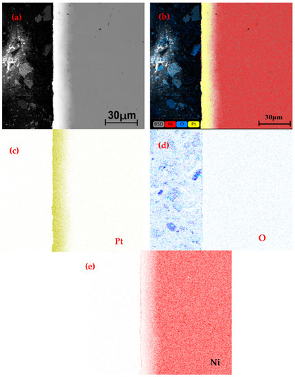 SEM–EDS plane scan of the interface of Sample 2 oxidized at 800 °C for 2 h: (a) SEM; (b) total; (c) platinum; (d) oxygen; (e) nickel.