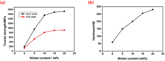 Variation curves of the mechanical properties of platinum-nickel alloys with different nickel contents obtained: (a) tensile strength; (b) hardness.
