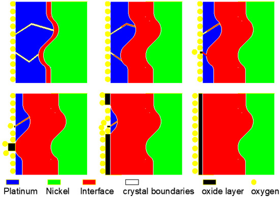 As can be seen from Equation (3), the square of the diffusion distance (x) was exponentially related to the absolute temperature (T) for the same oxidation time; the higher the oxidation temperature, the greater the diffusion distance of the nickel. The nickel did not diffuse to the surface and was not oxidized at a lower temperature (≤600 °C) for 3 h, whereas the nickel did diffuse to the surface and was oxidized at a higher temperature (≥700 °C) for 1 h, indicating that the platinum-clad nickel composite wire could be used at 500 °C and 600 °C for a short time. Determining whether it could be used for a longer time would require verification with a long-term oxidation experiment, which was not covered in this paper. Figure 14 shows a schematic diagram of the diffusion and oxidation process of the nickel. The grain boundaries could be considered to be defects in the crystal; the distortions created by the defects made it easier for the atoms to migrate than it would have been within an intact crystal. Thus, the rate of diffusion of nickel in the grain boundaries was greater than the rate of diffusion of nickel within the crystal. Under the conditions of the same platinum layer thickness and oxidation temperature, the nickel diffused through the grain boundaries to the surface in less time than through the bulk; therefore, the composite wire was oxidized earlier at the grain boundaries of the surface. Under the conditions of the same oxidation temperature, the thinner the platinum layer, the smaller the diffusion distance and the shorter the time for the nickel to diffuse to the surface. Due to the jagged interface and the uneven thickness of the platinum layer of the sample, the thinnest areas of the platinum layer were the first to be oxidized. Therefore, the service life of the composite wire was strongly dependent on the service temperature and the minimum platinum layer thickness.