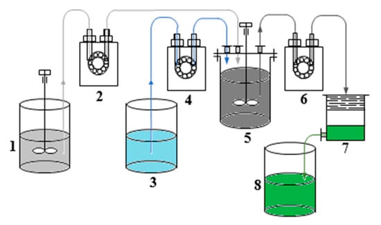Dry grinding of slag was carried out in grinding cups on a laboratory roller conveyor with the ratio grinding bodies: slag = 4:1 to ensure a material fineness of less than 80 microns. The process of slag leaching was studied by treatment with sulfuric acid solutions with concentrations of 7–12.5% at a solid–liquid ratio (S:L) = 1:(6–10) at a temperature of 20–40 °C. Slag leaching was realized in a glass reactor (XC-2L) equipped with an agitator and a temperature sensor. The stirrer rotation speed was 650 rpm. The pulp was filtered through a Nutsche filter. The undissolved residue was washed with water on the filter in the S:L = (1–5):10. In the batch process, the slag was loaded simultaneously. In the continuous process, the pulp (slag: water) and sulfuric acid were fed with the help of peristaltic pumps. Figure 1 shows the slag processing unit in continuous mode. At the first stage, 7.0 wt.% sulfuric acid preheated to 40 ± 2 °C was loaded into reactor 5. Next, slag was loaded simultaneously at a ratio of S:L = 1:9 into the reactor. After 55 ± 5 min after the start of the slag leaching, the pulp (slag: water = 1:3) was continuously fed into the reactor from tank 1 using peristaltic pump 2, and from tank 3 using pump 4–10.5 wt.% sulfuric acid solution containing 1.0 g·L−1 copper. Simultaneously, the pulp was unloaded using a peristaltic pump 6 to Nutsche filter 7. From it, the filtrate was fed to tank 8. The pulp and acid were loaded at a rate of 0.48 and 0.87 L·h−1, respectively. The reaction mass was unloaded at a rate of 1.35 L·h−1. Since the reaction of slag decomposition with sulfuric acid is exothermic, there was no need for additional heating of the reaction mixture. Before completion of the process, the pumps were stopped, and the reaction mixture was left stirring for 55 min. The undissolved residue was washed with water on the filter in the S:L = (1–5):10. The filtrate was sent to the dehydration stage.