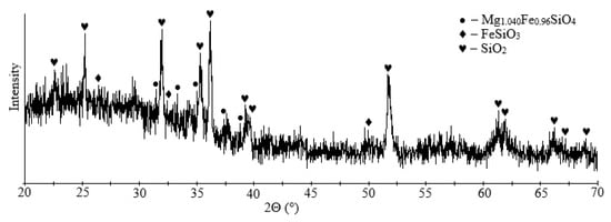 Granulated slag from the Pechenganickel plant consists of dense and tough black granules with a shell-like breakage and a glassy glitter. According to X-ray phase data, magnesia-iron glass (Mg1.04Fe0.96SiO4) is the main mineral component of the presented slag sample (~71%), ferrosilite was found in smaller amounts (FeSiO3) (~29%), as was quartz (SiO2); the sample structure was X-ray amorphous (Figure 2).
