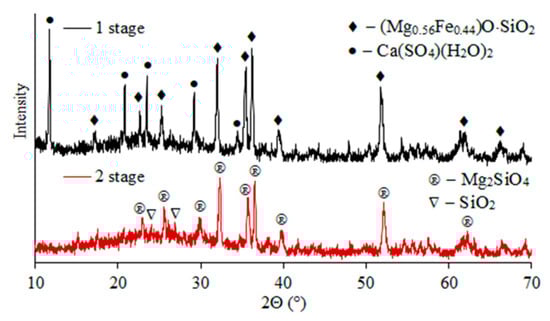 X-ray phase analysis indicates that ferrosilite (2(Mg0.56Fe0.44)O·SiO2)) and calcium sulfate (Ca(SO4)(H2O)2) form the basis of the cakes after first stage sulfuric acid leaching of slag (Figure 5). After the second leaching stage, the residue was magnesium silicate (Mg2SiO4) and quartz (SiO2).