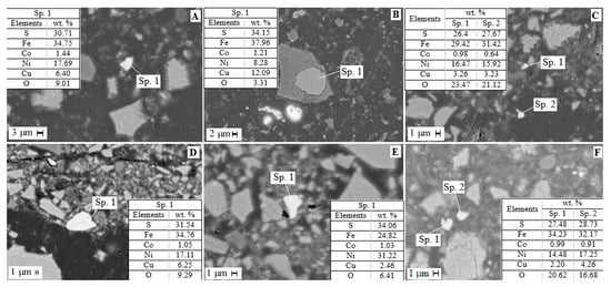 Mineralogical investigations revealed that the slag matrix consists of olivine, fayalite and glass. Slag glass contains almost no impurities of non-ferrous metals in an isomorphic state; these impurities are concentrated entirely in sulfide alloy inclusions. According to the electron microprobe analysis, the alloy is a pyrrhotite solid solution containing Fe 49–55%, S 34–39%, Ni 4–8%, Cu 2–6% and Co 0.2–0.3%. Inclusions of sulfides in the slag are distributed unevenly and not in all slag grains. Sulfide inclusions are rounded excretions and complex sulfide formations of a curved shape (Figure 3). The sulfide sizes range from 5 to 20 μm. Larger grains up to 50 µm in diameter can also be observed. In the slag matrix, represented by the glass, skeletal needle-like crystals of olivine are observed to form a spinifex structure (Figure 3A,D).