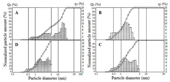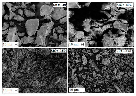 Studies of the particle size distribution of SiO2 samples exposed to ultrasonic dispersion showed that the average particle size decreases with an increase in the specific surface area of the specimens; the smallest particle size has the sample SiO2-270 (Figure 9). According to the results, the SiO2-40 sample, with a surface area of 525 m2·g−1, has a particle size of less than 2 to 120 μm, with 75% being less than 60 μm, 50% less than 36 μm and 15% less than 8 μm (Figure 9A). When the SiO2-40 sample is treated with hydrochloric acid, the particle distribution does not change (data for the SiO2-40C specimen were not presented). For the SiO2-150, the particle size varies from 1.2 to 82 μm, with 95% being smaller than 53 μm, 75% smaller than 22 μm, and 41.6% smaller than 8.1 μm (Figure 9B). For sample SiO2-270, the particle size varies from 1.6 to 49.8 μm, with 49% being less than 7 μm (Figure 9C). The decrease in the average particle size is probably due to the faster kinetics of SiO2 particle formation with an increasing dehydration temperature.