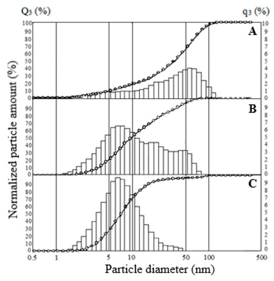 Particle size distribution for SiO2 samples: (A) SiO2-40, (B) SiO2-150, (C) SiO2-270.