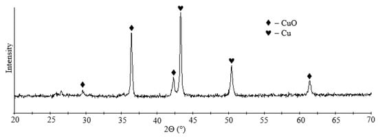 The traditional option for removing copper from acidic effluent, mine and quarry waters is cementation with metallic iron, which can result in copper concentrate [57]. As a result of cementation, a copper recovery of more than 99% was achieved, and the residual copper content in the solution was 0.5 ppm. According to XRD data, copper cementite contains copper and copper oxide (Figure 10). The blister copper obtained can be used for smelting in production.