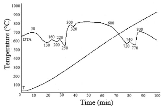 Iron and magnesium can be separated by hydrolytic precipitation of iron, recrystallization or by electroflotation methods [66,67]. Generally, these methods are based on the pre-oxidation of iron(II) to iron(III). However, these methods are not devoid of disadvantages, since hydrolytic precipitation produces contaminated, hard-to-filter high-watered residues. Crystallization often does not achieve 100% yield of the target component. The need to dilute concentrated solutions is a significant disadvantage when using electroflotation. For separating iron and magnesium from solutions after nonferrous metal extraction, we proposed a principally new approach based on temperature differences in the thermal decomposition of sulfates that are part of the obtained solutions. It is well known that an iron (II) and aluminum sulfate thermal decomposition reaction with the formation of their oxides occurs in the temperature range of 580–750 °C, and the decomposition of magnesium sulfate to form magnesium oxide occurs at temperatures above 1100 °C. The solution obtained after extraction of the nonferrous metals was dehydrated in a spray dryer at 200 °C. The result was a powder containing iron, aluminum, magnesium and calcium sulfates. Figure 12 lists the results of the TG-DTA analysis of the dehydrated powder. According to the thermogravimetric analysis, the thermogram of the sample includes several stages of mass loss. The first stage of heating from room temperature to 250 °C involved the removal of physically adsorbed water. Accordingly, peaks corresponding to the endothermic effect are observed in the specified temperature range. Weight loss at this stage is 21.59%. In the second stage, the mass loss is 40.34%. The DTA curve of the samples exhibits two peaks at 720 and 740 °C. In this temperature range, iron and aluminum sulfates decompose to their oxides.