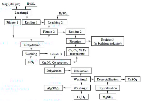 According to the obtained results, a slag utilization scheme was proposed, which includes slag leaching with a sulfuric acid solution, dehydration of leaching solutions, and washing of dehydrated powder to obtain amorphous silica and a solution containing iron, magnesium, aluminum and non-ferrous metal sulfates (Figure 15). The residue is a flotation to produce a concentrate of non-ferrous metals. The residual can be used in the construction industry. Cementation separates copper, nickel and cobalt from the solution obtained, and precipitates as sulfides. The solution obtained after the separation of non-ferrous metals is subjected to dehydration, followed by washing from water-soluble impurities and received iron oxide powder and the solution containing magnesium and calcium sulfates. Then, the filtrate is recrystallized to separate calcium sulfate. After the crystallization of the solution purified of calcium ions, magnesium sulfate is obtained.