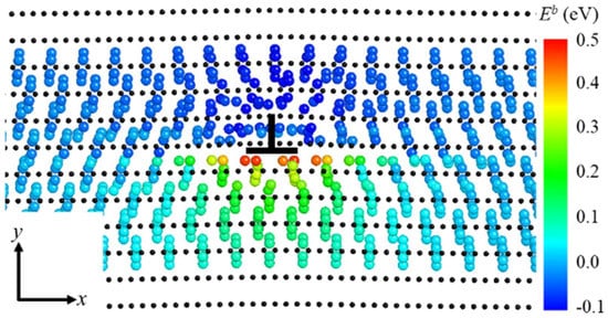 H binding energies are displayed as a function of H positions in Figure 1, where Fe atoms are represented as small black spheres, and H positions are represented as large spheres. Sites with strong H-dislocation binding energy are distributed around the dislocation core. The maximum H-dislocation binding energy arises just beneath the slip plane, at a distance of ~1.5 Å from the core. The maximum binding energy is 0.468 eV. It is noted that the binding energy spreads widely in the slip plane in Figure 1. The similar observations are obtained in interactions between H and an <111> {112} edge dislocations, as well as between H and {111} <110> edge dislocation in Ni. It seems likely that H distribution can spread in the slip planes of edge dislocations whether the core structure is compact or dissociated [35]. This is contrary to the isotropic elasticity in that there is no interaction between a solute (H) and an edge dislocation if the solute is located in the slip plane, since the pressure created by the dislocation in the slip plane is zero [26]. Considering the typical stress exerting in the slip plane is shear stress, thus, H interacting with shear stresses can be assumed.