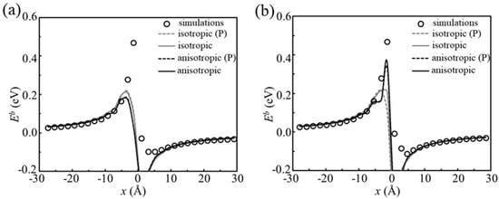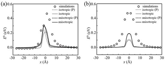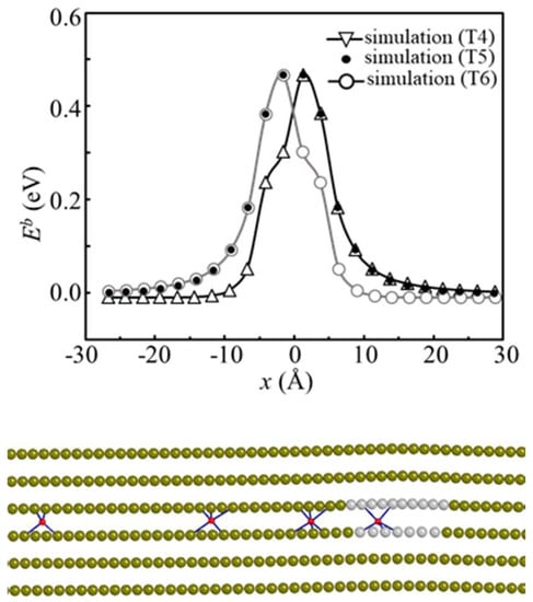 A comparison of the H-dislocation binding energies between atomistic simulations and isotropic elasticity are presented in Figure 3. Two types of calculations are performed using elasticity to study H-dislocation interactions: calculations only considering dilation and calculations considering all strains induced by H. In these calculations, it is assumed that H-induced strains in the strained crystal are the same as the ones generated at T sites in the perfect crystal. Considering the strains of the crystal induced by a dislocation is small except the core region, this assumption is reasonable. When H is pre-placed at T5 sites (Figure 3a), perfect agreement between elasticity and simulations is observed at the H-dislocation distance greater than ~19 Å, and within this distance elasticity underestimates the binding energies. Since elasticity predicts zero pressure precisely in the slip plane, if one only considers the dilation effect of H placed close to the slip plane, there are weak interactions between H and the dislocation. Moreover, the two calculations predict almost the same binding energies. This is because H at T5 sites only generates strains along the axis but no shear components, and the calculations using Equations (2) and (4) are identical. However, when H is placed at T4 sites, which generates a shear component ε12 = 2.27%, the situation changes. Based on Figure 4b, it is clear that, if considering all strains induced by H, the obtained binding energies agree better with simulations than those considering only dilation. Thus, shear strains are attributed to H-dislocation interactions. It is noted that the shear stress created by the edge dislocation at x < 0 is negative, because the product of is negative at x < 0 (i.e., repulsive H-dislocation interactions), while the is positive at x > 0, (i.e., attractive H-dislocation interactions). Therefore, the H-dislocation binding energies are lower at x < 0 than the ones at x > 0 at T4 sites, as presented in Figure 2. Because T6 sites and T4 sites generate the same axial strains, but the opposite and equivalent shear strains, the results at T6 sites are the reflection of the ones at T4 sites with respect to x = 0 (Figure 2).