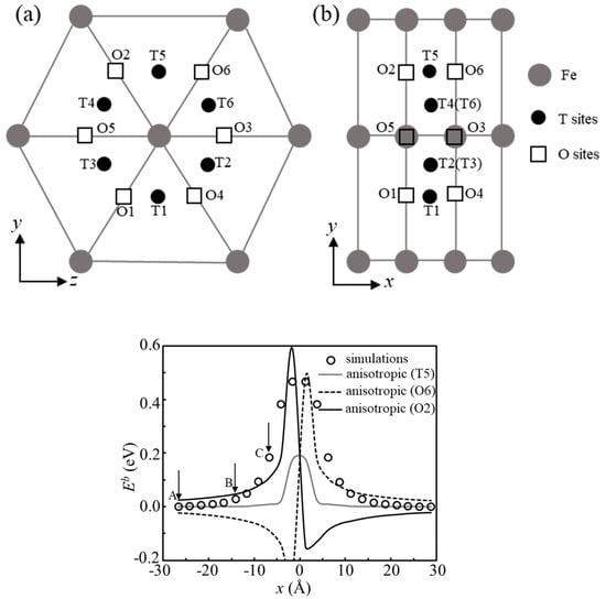Instead of assuming H occupying T sites when stable, one can assume that H occupies an octahedral site (O site). In fact, O sites can have stronger H trap-energy than T sites in bcc iron under pure shear strains, depending on the position of H relative to the central Fe [38,39]. Anisotropic strains in bcc iron can induce a solution energy at an O site as low as that at T site, resulting in enhancement of H atmosphere. Considering the complicated stress fields around a dislocation and the short distance between a T site and a neighboring O site (~0.71 Å), H may easily migrate to neighboring O sites from initial T sites. There are two nearest O sites in the neighborhood of a T site; the relative positions of the T sites and O sites are represented in Figure 5a,b. A comparison of the simulation results and elasticity assuming H at T5 sites or O2 sites or O6 sites is displayed in Figure 6. It is seen that the elastic calculations assuming hydrogen at O sites agree better with simulations near the core than that at T sites, while the calculations at T sites precisely agree with simulations far away from the core.