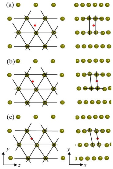 Equilibrium configurations show the relative H positions in different stages. (a–c) represent the configurations of point A, B and C in Figure 5, respectively. Projection on the x plane is displayed on the left and projection on the z plane is on the right. The gold spheres represent Fe atoms and the red spheres represent H atoms.