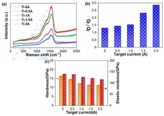 (a) Raman spectrum, (b) intensity ratio of D−peak to G−peak, (c) hardness and elastic modulus of the films at different titanium currents.