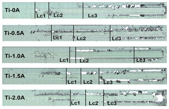 Figure 3 shows the scratch optical picture of the bonding strength of the film and substrate. From the figure, we can see that complete peeling of the film occurs at the edge of the scratch, which indicates that the film is well bonded to the substrate. With increasing titanium current, the bonding strength of the film base is gradually enhanced; the lowest bonding strength is 19.54 N for Ti-0 A film, and the best bonding strength is 41.69 N for Ti-2 A film. It is known that an increase in Ti content can enhance the bonding ability of the film and substrate [].