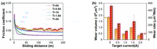 (a) Friction curve and (b) wear volume and wear rate of the film at different titanium currents.