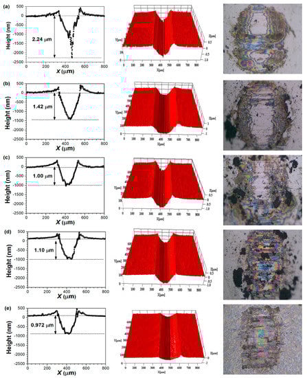 The prepared Ti/TiN/a-C:H:Ti films were subjected to friction tests under atmospheric conditions. As shown in Figure 5, the three-dimensional profile of the abrasion marks shows that the abrasion marks are mainly characterized by furrow wear [], and the depth of the abrasion marks becomes shallow with increasing Ti current and is lowest at 2 A. From the photomicrographs of the wear spots of the dyadic balls, it can be seen that there are carbon films on the surface of the balls, and the adhesion is slight at the Ti-2 A. Combining the friction coefficient, wear volume, and wear rate, the best tribological performance of the Ti-2 A sample can be seen.