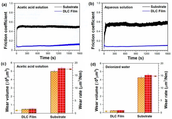 Friction coefficient between Ti-2 A film and substrate: (a) acetic acid solution, (b) aqueous solution and wear volume and wear rate, (c) acetic acid solution, and (d) aqueous solution.