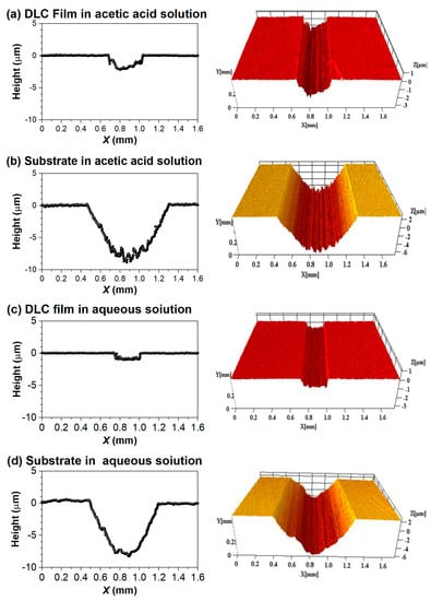 The wear marks and wear depth of the DLC film in both solutions were observed using a three-dimensional profilometer, as shown in Figure 7. It can be observed that the wear marks of the film in both acetic acid solution and aqueous solution are shallower and narrower than those of the substrate, indicating that the DLC film provides good protection to the substrate under corrosive media. The wear depth in the acetic acid solution is deeper than that in the aqueous solution, and it can be seen that the wear depth curve fluctuates more in the acetic acid solution while the wear depth curve is smoother in the aqueous solution because the stronger corrosiveness of the acetic acid solution intensifies the mechanical wear during sliding [,].
