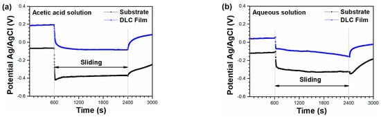 The open circuit potential tested in a tribocorrosion test is a mixed potential that represents the combined state of worn and unworn material in the wear trajectory. Therefore, it is commonly used to assess the corrosion resistance and stability of the sample []. Figure 8a,b show the continuous variation in the open-circuit potential before, during, and after friction for the coated samples and substrates in acetic acid solution (pH = 3) and aqueous solution. The open circuit potential remains stable before the start of friction, which is due to the oxide film generated on the sample surface in the solution, which inhibits the corrosion of the sample by the solution [,]. In the initial stage of the friction corrosion test, a sharp decrease in the open circuit potential curve with time was observed due to the change in the contact surface state caused by the sliding of the mating pair on the sample surface. The open-circuit potential stabilized for some time afterwards, which can be explained by the removal and generation of the passivation film reaching a dynamic equilibrium [,]. Additionally, the open circuit potential in acidic solution is overall lower than that in aqueous solution, indicating that the film is more prone to corrosion with the substrate in strongly corrosive media. A significant positive shift in the open circuit potential of the film can be seen in the figure, both in the acetic acid solution and in the aqueous solution, indicating that the film has better corrosion resistance than the substrate.