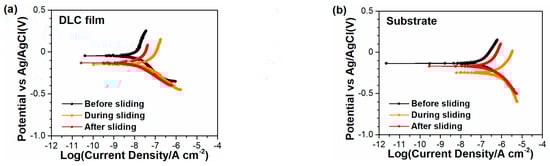 The Tafel polarization curves of the film and substrate in aqueous solution before, during, and after friction are shown in Figure 9. Table 2 shows the electrochemical parameters of the film and substrate in aqueous solution before, during, and after friction. As seen from the figure, the polarization curve tested before friction had the highest corrosion potential, and the sample was corroded, resulting in a negative shift of the polarization curve due to a change in the state of the contact surface caused by the sliding of the mating sub on the sample surface. The polarization curve after friction was tested a few minutes after the end of friction. The polarization curve shifts positively, but the corrosion potential is still smaller than the potential before friction, which is due to the friction causing the sample surface to be worn down. After the friction ends, the corrosion potential shifts positively due to the generation of a passivation film [].