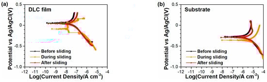 Polarization curves of (a) film and (b) substrate in aqueous solution before, during, and after rubbing.